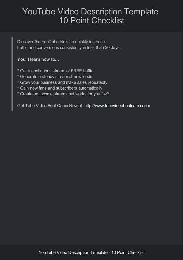 How To Write An Effective YouTube Description - The ... from www.tubics.com Follow this youtube description template to learn how to write a youtube video description that will generate more views. What is the description of a youtube video? That's why we've created video description templates for seven different business youtube video types. Envato.com has been visited by 100k+ users in the past month How to optimize for ctr: Placeit.net has been visited by 10k+ users in the past month How long to make your youtube video description, and how to make sure you've included your target keyword enough times. Tips to write search snippets that make people want to click.